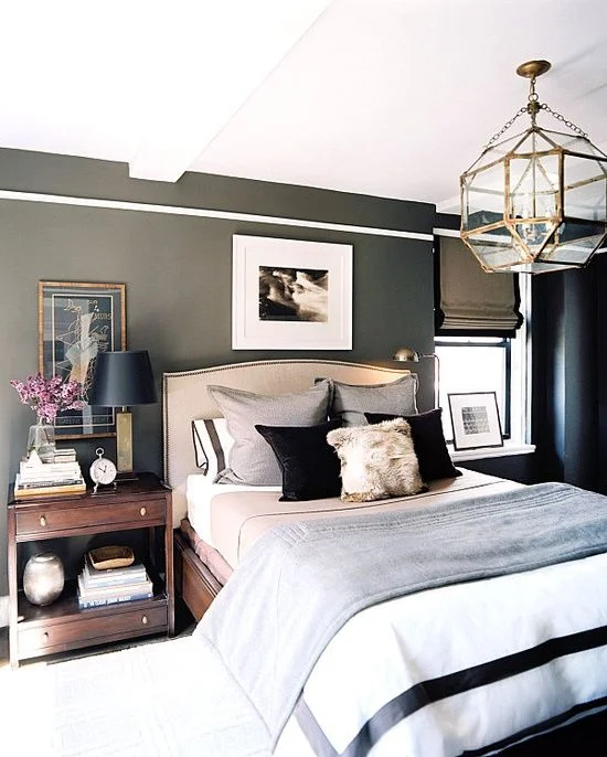 What better place to start my first design post than in the bedroom? Right?? I've been really drawn to masculine bedrooms lately. I think it has something to do with the reflective objects and hardware that shines just right against the dark walls and furniture.