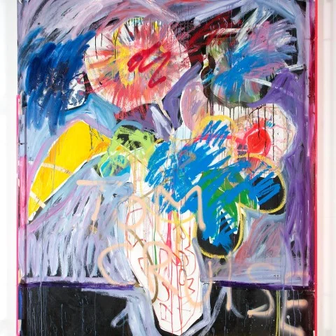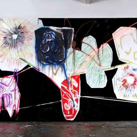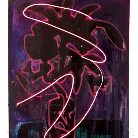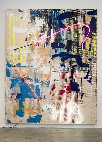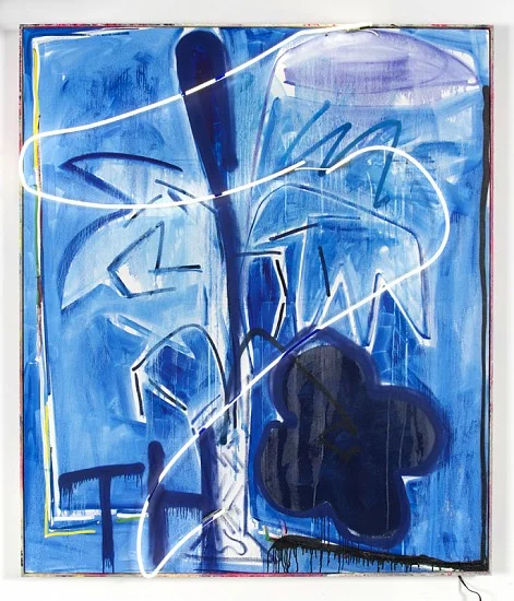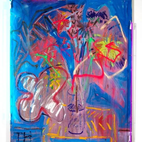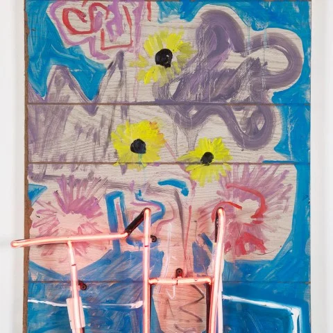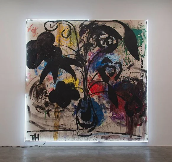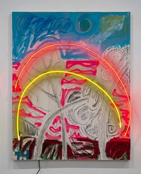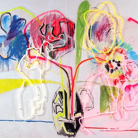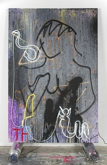 I recently learned of Thrush Holmes from Domino magazine. I instantly have become a big fan of his work. In many of his works he uses traditional motifs, like flowers, but in a hip, contemporary way. But what really sets Thrush's work apart is his use of neon incorporated in his paintings. Within minutes of finishing his painting he is setting the neon. He feels like if he waits to put the neon on "some of the romance of the act is lost. It can't be an afterthought."