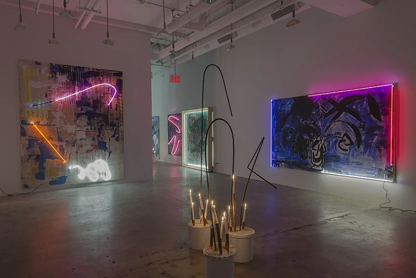 I'm sure the paintings with neon just come alive at dawn and dusk when you can see the painting and neon in unity. Could you imagine a traditional space with this fun, funky art? I truly love a mix of traditional antiques with touches of contemporary. Take note of the titles of his work too. Some of them make me really laugh. Now, I'm off to crack the boys' piggy banks.
